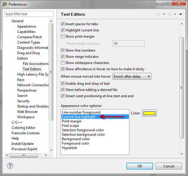 Demonstrating software and tools for a smaller or larger audience is always a challenge. What looks good directly in front of your screen might not get the same attention if projected on a wall. Especially if you are browsing through the source code and you need the audience to follow this. What I have found very useful in CodeWarrior is the ability to configure it using colors. One thing I have configured is to show the current line in a different color: