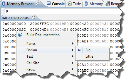 I admit: In my mindset I feel I’m more attached to the big endian view of the world. But it is just a view. The good thing is: eclipse can view it from both sides (with a view :-)) as outlined in Memory is Everything, using the Memory Browser view: