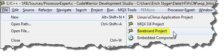 Menu to create new bareboard project Published March 8, 2012 at 716 × 179 in Quickstart for Processor Expert in Eclipse Menu to create new bareboard project Menu to create new bareboard project