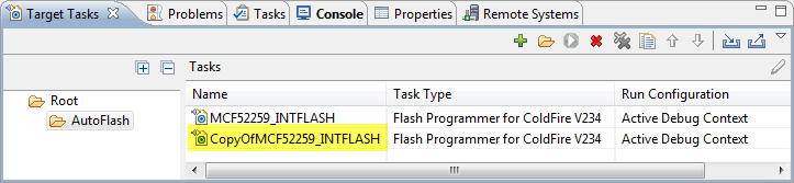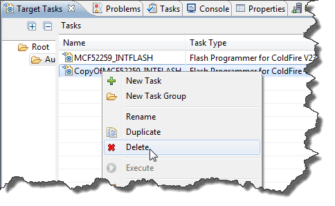 Target Tasks are used to perform flash programming for the ColdFire V2-V4, or to do things like Hardware Diagnostics. Target Tasks are managed in the Target Tasks View: