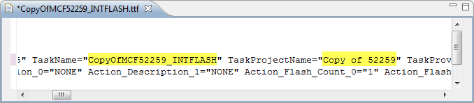 3. In the editor, find the string for the TaskName and TaskProjectName: Note that the task name is not matching the file name and the project it should belong to: