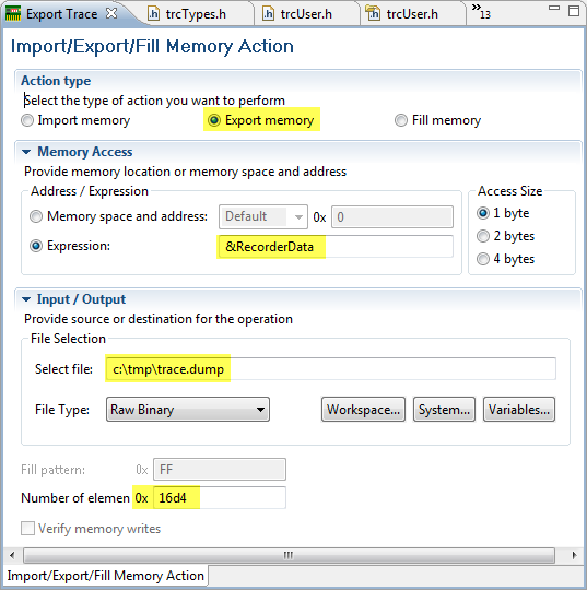 The simplest way to get the trace data is to run the application and stop it with the debugger, then dump the trace information. To save the trace to a file, I can use a target task to export and save a memory block: I specify the Recorder Data variable (&RecorderData), the file name and the size (which depends on your trace data structure):