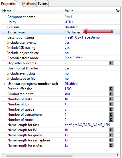 With the FreeRTOS Hardware Trace I have a good base. So what I need is instead tracing to an external hardware, I need to trace to RAM and using the FreeRTOS+Trace API library. To make things really easy to use, I have extended the existing FreeRTOSTrace component and created a new PercepioTrace Processor Expert component. Additionally I have changed the FreeRTOS component to use a free running counter instead of a normal timer interrupt: this allows me to gather performance data for the Percepio Trace.