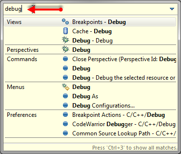 - Switching to the debug perspective: CTRL-3, perspectives d, ENTER