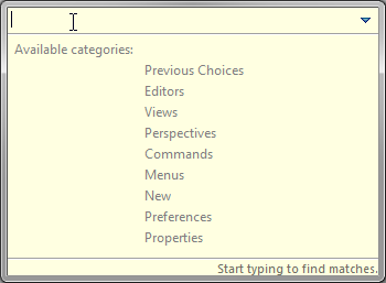 Well, that does not look exciting. But if I read the dialog, it tells me the categories: Previous Choices, Editors, Views, Perspectives, Menus, and so on. And that I can simply start typing: