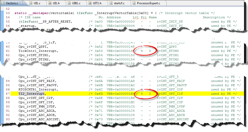So what now? Because Processor Expert is not catching this interrupt overlapping, I can check the interrupts with their priorities in Generated_Code\vectors.c: