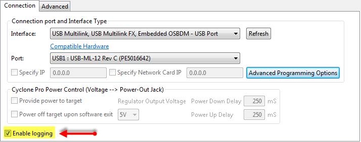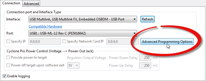 So flashing the application on top of the bootloader means that I should not erase the flash below 0x4800. I need to tell the debugger this. The solution is to use the P&E Multilink with the ‘Advanced Programming Option’: