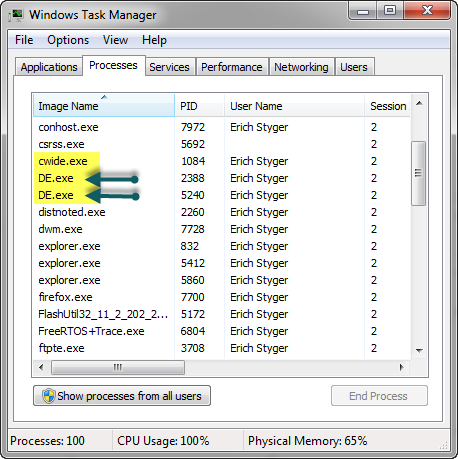 - If I face problems with connecting to my board, I check in the task manager if I have multiple instances of DE.exe (or even multiple cwide.exe instances). If so, I kill them with the task manager.