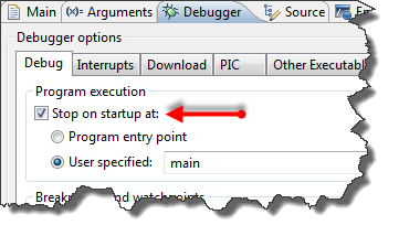 The interesting part is step 3: The debugger sets a temporary breakpoint. Usually this breakpoint is set at main(): that way you download your application, and your target will stop at main(): Usually what I want as I do not need to step through the startup code.