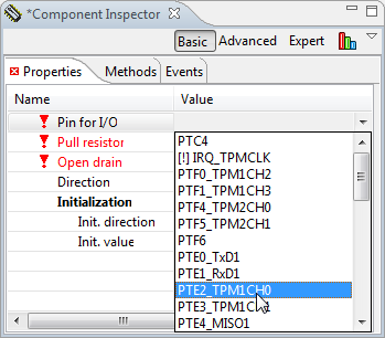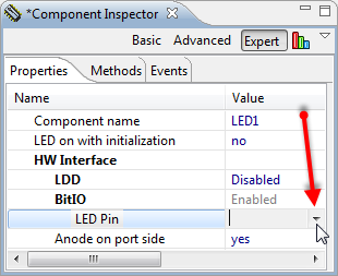 Trying to follow through as close as I can, using my own MC9S08AC128 board, all is good until I to to select the LED Pin – there is no dropdown or other means to select one. Is there some setting dependency, so there is something I should have done before adding the LED component?