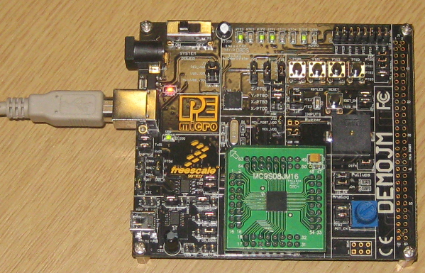 I’m using the Freescale DEMOJM board with the S08 MC9S08JM16 CPU. This board allows swapping microcontrollers (S08JM16, S08JM60 and ColdFire V1 MCF51JM128). The board has useful components (LEDs, buttons, accelerometer, butter) and the pins of the microcontroller routed to a connector, making it a good board to connect with my own hardware.