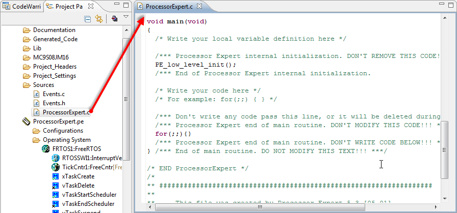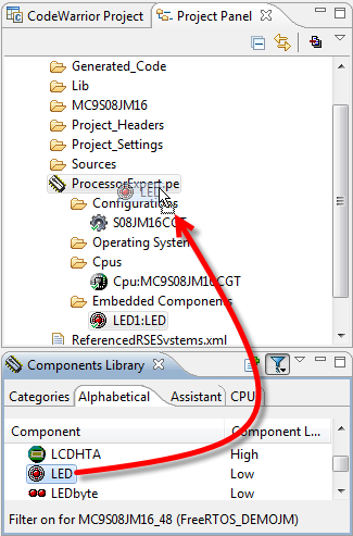 - Project Panel View: shows the ProcessorExpert.pe which contains all the components.