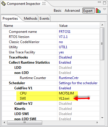 If I would use the ColdFire MCF51JM128 with my board, then the Processor Expert FreeRTOS component would recognize the V1 core being used, and enable the ColdFire V1 settings. As the interrupt settings differ from family to family, and multiple vectors are possible, I have a choice of different vectors: