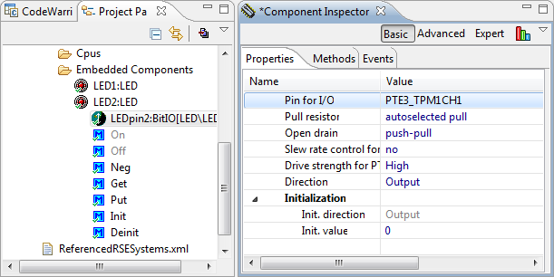 Yes – out of the box, LDD is disabled, BitIO is enabled. If I click the value column for LED Pin, I get an error, due to the pin being unassigned. So I go back to Project Panel, expand LED1:LED, go to LEDpin1:BitIIO, then select the pin I require in properties, and all is good. Yes, I didn’t realise I had to click into that field. Now I just have to check my schematic to find what pin the LED is actually attached to!