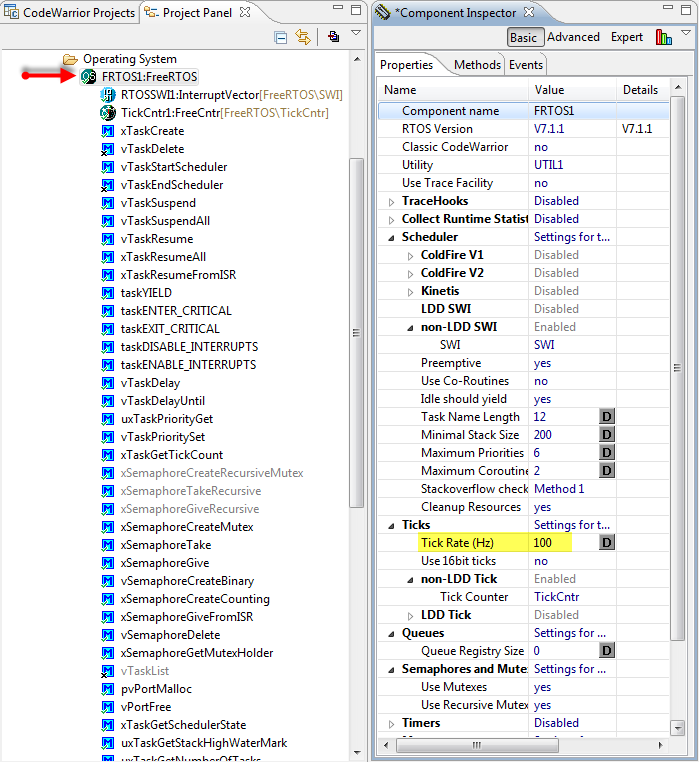 Again, the FreeRTOS component needs some additional settings. Unfolding the component shows that the software interrupt vector needs to be configured: