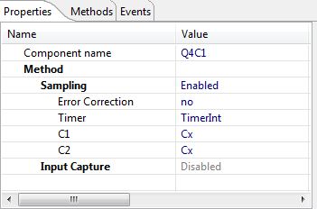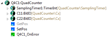 This component is called from the Tacho component and decodes the C1 and C2 quadrature signal. GetPos() is used to return the current position, and SetPos() can be used to set/reset the position value: