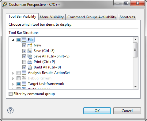 In the default C/C++ perspective I have a total of 9 views. What I want is to get it down just to what I need. That means removing views and toolbar buttons.