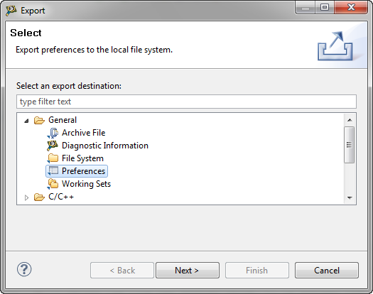 - Now I follow the steps outlined in Copy my workspace settings: I export my workspace settings into a file: Menu File > Export > General > Preferences:
