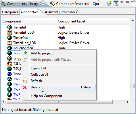 • Copy-Paste of Processor Expert components between projects and workspace. And now it is possible to use a shortcut (Delete) to remove a component:
