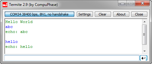 Time to compile/build the application. Running it on the board prints a ‘hello world’, and the sends back the incoming strings and characters: