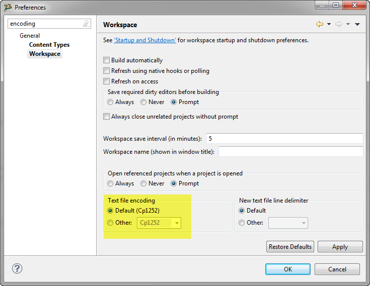 But what encoding uses Eclipse? It must be the code page set by the Java environment? I find the settings under the menu Window > Preferences: