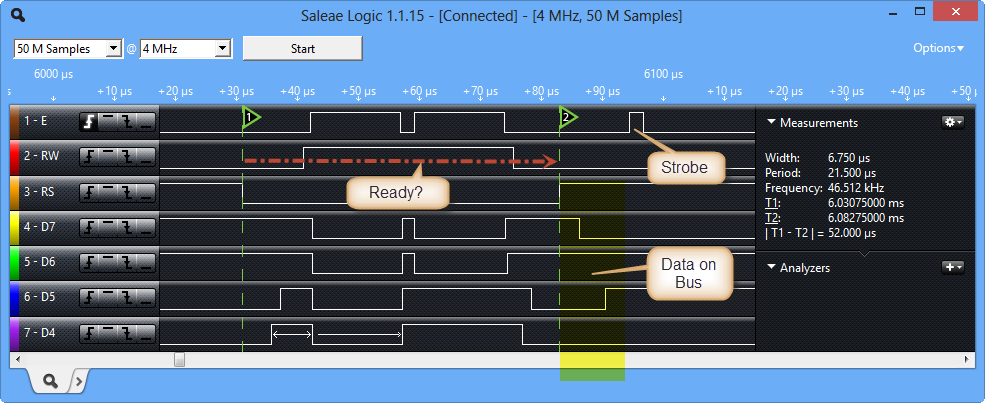 The screenshot below shows the communication: first it reads from the LCD if it is ready (pulling down RS, then reading two 4-bit values). If ready, it pulls RS to HIGH level and puts the data on the bus. Then the data is transmitted with a Strobe signal on the E line: