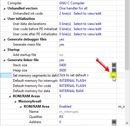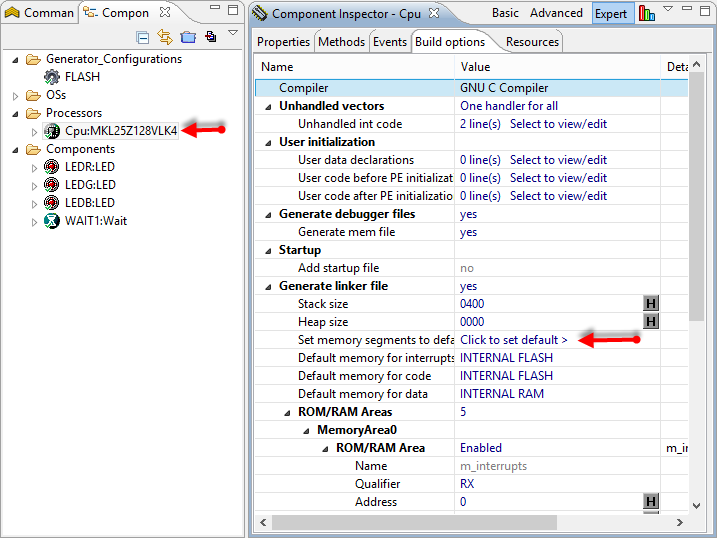 To migrate existing Processor Expert projects to the simplified memory map, I select the CPU component. In the Build Options tab I choose ‘Click to set default’ to apply the new memory map: