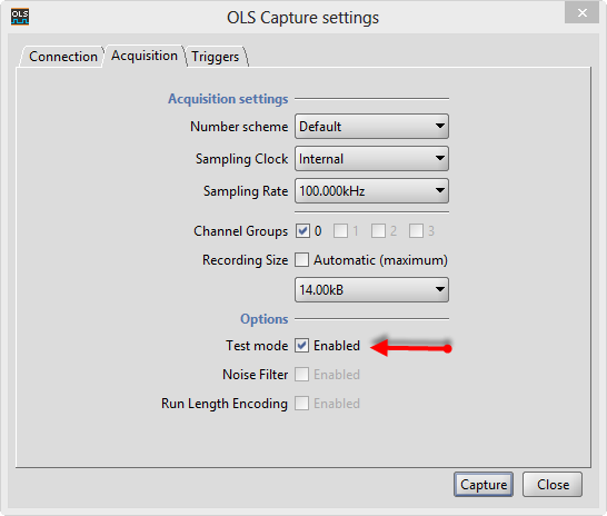 Currently up to 8bits are supported, and only ‘Stage1’ triggers in Parallel mode. So no sequencing yet. With enabled triggers, data capturing is waiting until the value bits are matching the mask bits: (data&maskBits)==valueBits. The ‘before’ and ‘after’ ratio is not supported yet.