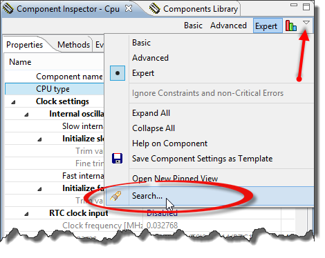 That filter capability is implemented in many Eclipse dialogs and settings, so I really missed it for the Processor Expert component settings. For example the CPU component has roughly 300 different properites, making it really hard to find what I’m looking for to configure: