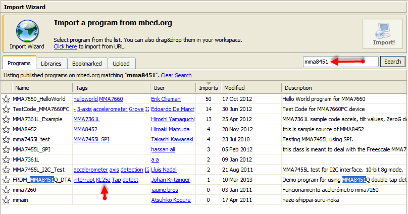 The cool thing with a web based IDE like mbed is that you can share and use code and libraries. To import an existing program, I use the Import button: