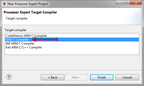 The Processor Expert project is created with the menu File > New > Processor Expert Project: Nothing special here, but as Red Suite is using gcc, the GNU C Compiler has to be selected during project creation: