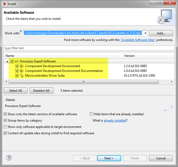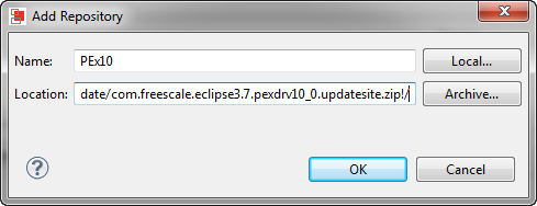 Again, same procedure: Menu Help > Install New Software, selecting the archive, and this time “com.freescale.eclipse3.7.pexdrv10_0.update.v1_0_0.zip“: