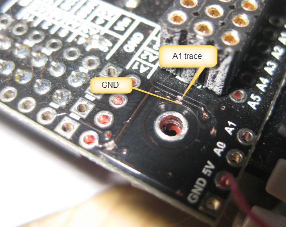 Only to re-appear after 10 minutes 😦 But this time clearly the signal was down at 0V. Removing the FRDM-Board, and it was still at 0V! Ok, somewhere there is a shortcut to ground 😦 Disassembling the robot (painful!). Following all traces, and then, finally I have found it: