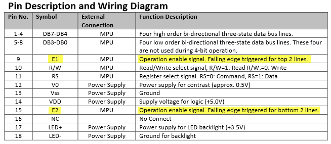 Looking at the data sheet, there was something interesting about it: the display has not a single ‘E’ signal, it has two: E1 and E2!
