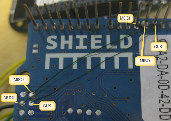 Next, I wired the SPI Signals MISO, MOSI and CLK to the Arduino header pins: