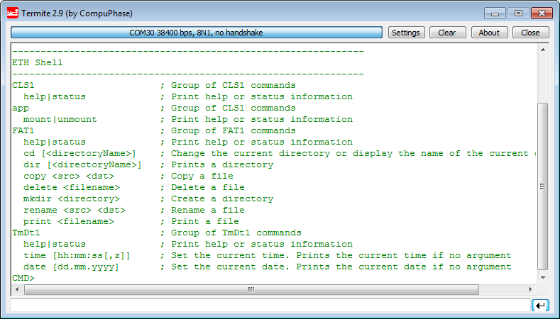 Because there is no ‘card detect’ pin available with the SD card socket, I have added the ‘mount’ and ‘unmount’ commands to the application shell command handler:
