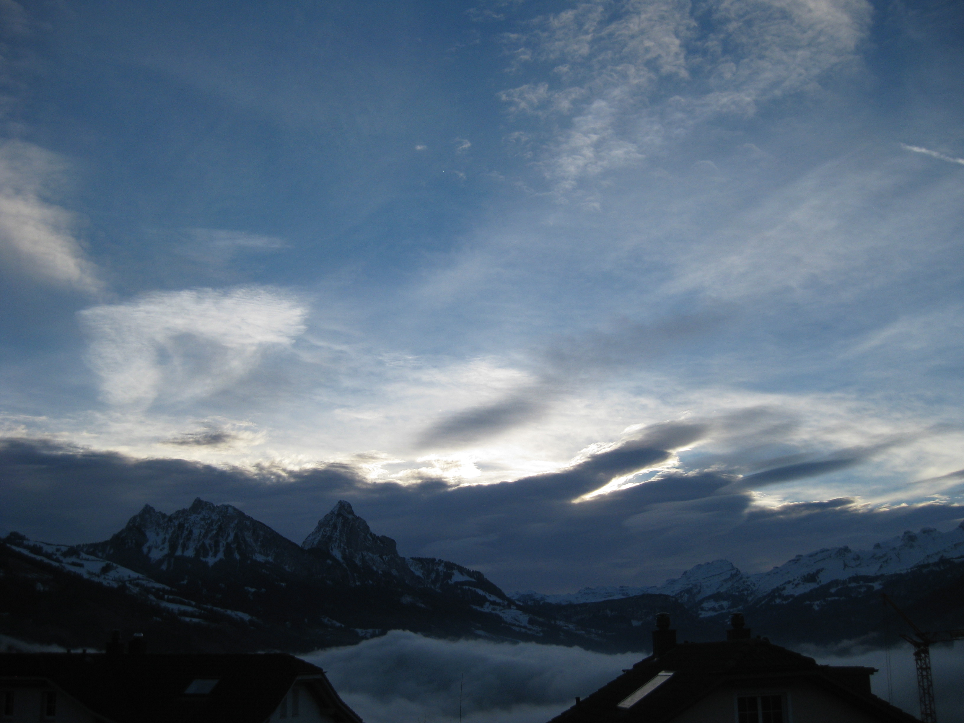 The local weather in my area in Switzerland has amazed the past weeks. It has been much warmer than usual. And the weather fronts are changing daily. Having a Föhn (or Foehn) situation in the north valleys of the Alps: warm air with turbulence, fighting with the cold air and ground fog trying to get in. In the sky, the waves of the wind are creating stripes and waves of clouds. A battle to watch for hours….