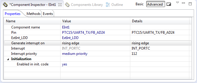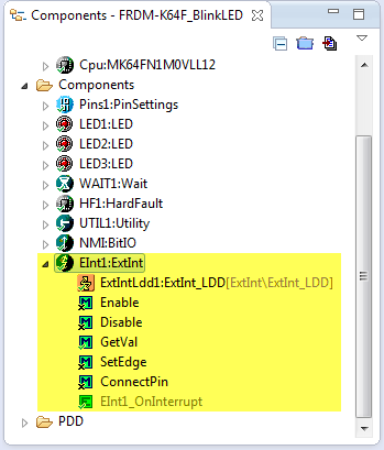 Processor Expert takes care about the interrupt vectors and vector table. To define my own interrupts, I can use the InterruptVector component which allows me to add my function name to the vector table. If I want to use interrupts with general purpose I/O pins and want to configure properties like pull-resistors, then the preferred way is to use the Init_GPIO component. The ExtInt component on the other side is a convenient way to act on external interrupt and to configure the interrupt properties.