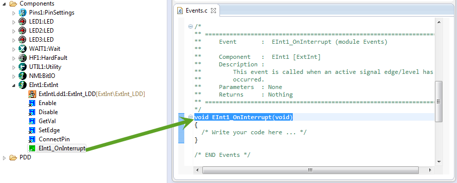 The interrupt itself gets handled in the component itself: all what I need to do is to fill out my user code in the Events.c module: