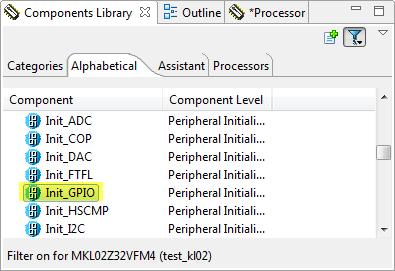 If I want to configure a pin to create an interrupt on a specific event, I can use the Init_GPIO component found in the Components Library: