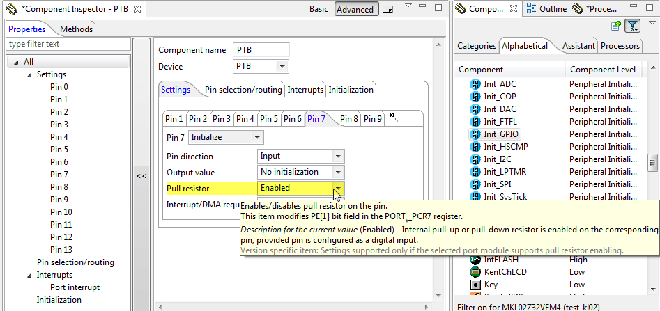 I use a KL15. On my project only pins on PTA and PTD are available for EInt component. Why? I would like to also use PTB, PTC or PTE. Is that possible? How do I configure it?