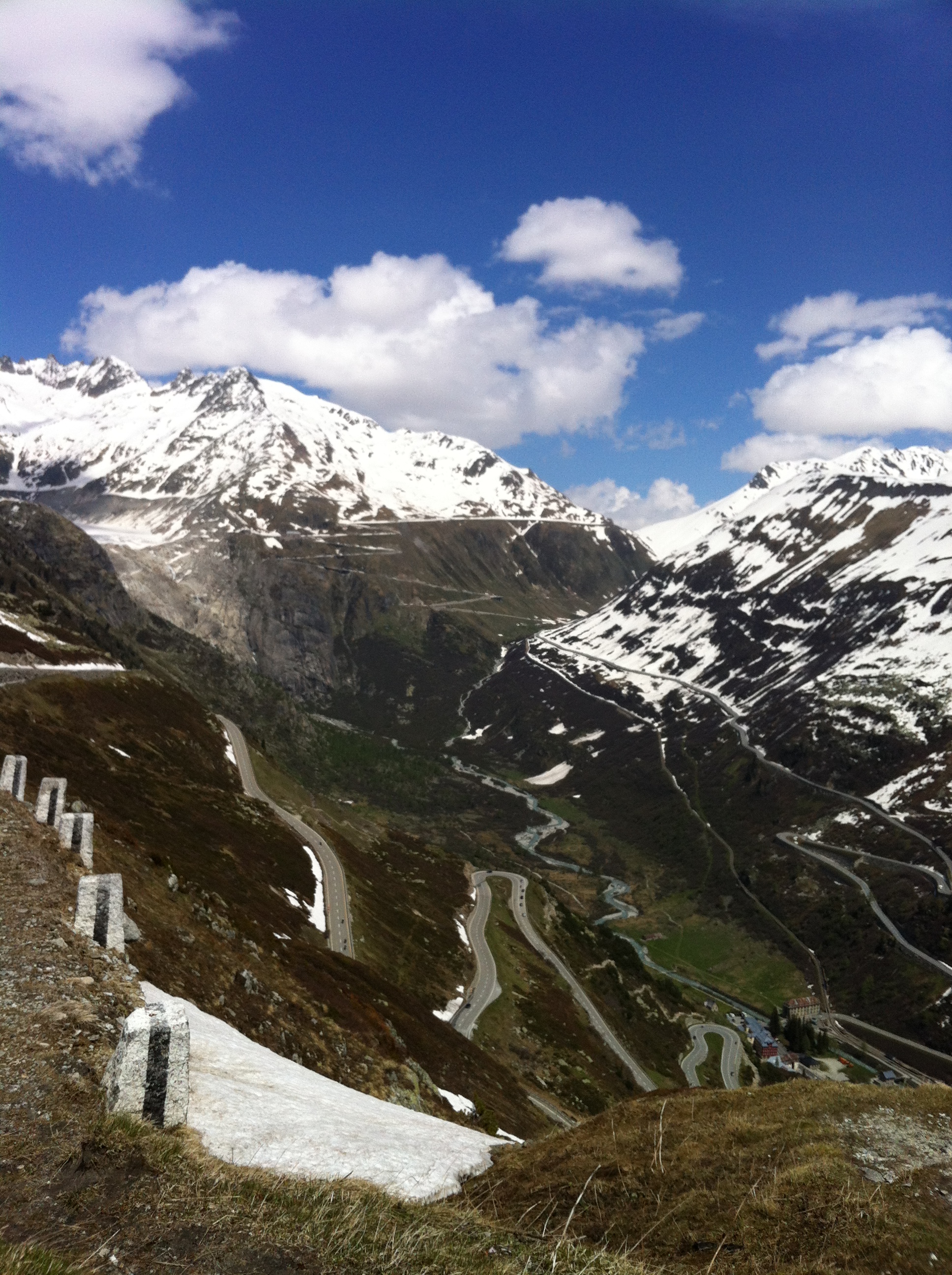 From the Grimsel pass, the view to the next pass: Furka. Need to drive down into the valley and then up on the other side: