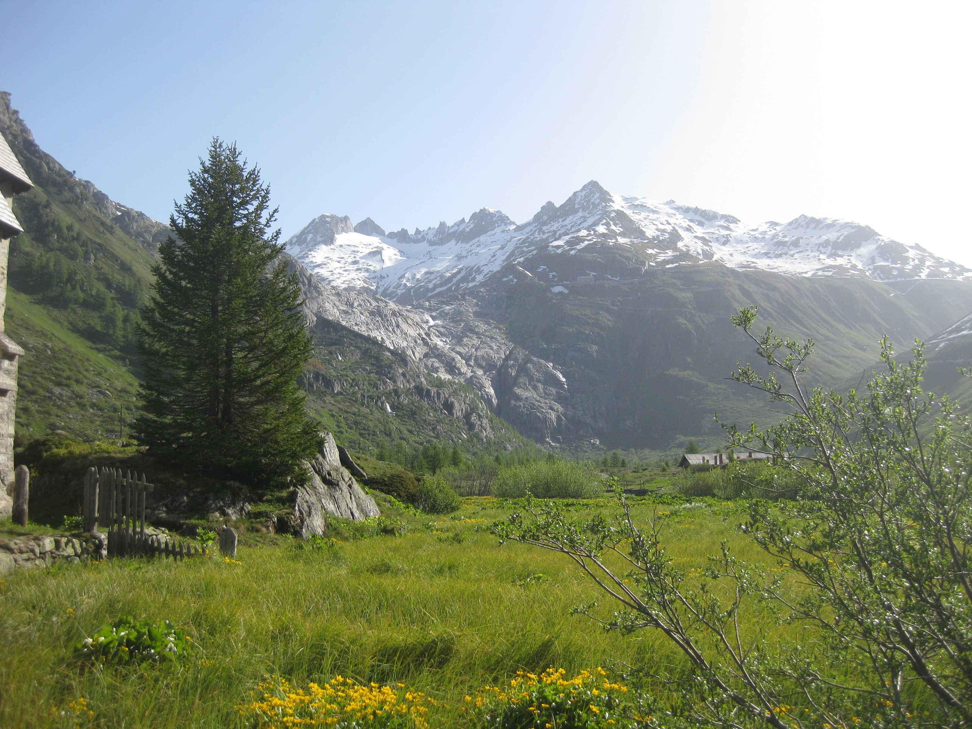 In Gletsch, view to Rhone Glacier. Furka Pass is on the top right.