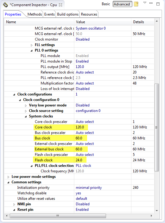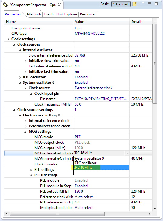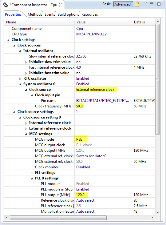 The important thing to know is that the output clock (REF_CLK) is twice of the 25 MHz clock: a 50 MHz oscillator clock. With this information, I can configure the settings of the CPU in Processor Expert as below to produce a 120 MHz PLL output: