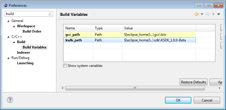 To have things independent where the SDK is installed, I have two variables defined in my workspace: ${KSDK_PATH} and KSDK_LOC: