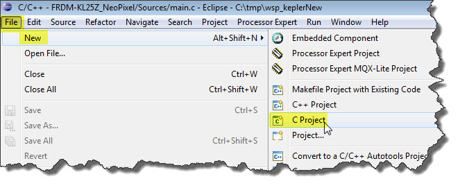 - Menu File > New > C Project: