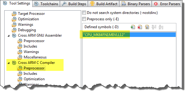 #elif (defined(CPU_MK64FX512VDC12) || defined(CPU_MK64FN1M0VDC12) || defined(CPU_MK64FX512VLL12) || \ defined(CPU_MK64FN1M0VLL12) || defined(CPU_MK64FX512VLQ12) || defined(CPU_MK64FN1M0VLQ12) || \ defined(CPU_MK64FX512VMD12) || defined(CPU_MK64FN1M0VMD12)) #define K64F12_SERIES /* Extension register headers. (These will eventually be merged into the CMSIS-style header.)*/ #include "device/MK64F12/MK64F12_adc.h"I have the MK64FN1M0VLL12 on my board, so I specify this in the compiler preprocessor settings: