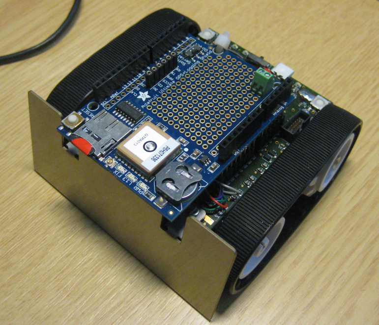 Removing the need for the Freescale FRDM board on the robot as in the previous design now makes it possible to stack normal Arduino boards on the robot. The pictures below show the robot using the Adafruit GPS Shield (see “Tutorial: Freedom Board with Adafruit Ultimate GPS Data Logger Shield“) and the Adafruit WiFi shield, making the robot really easily extensible with off-the-shelf shields: