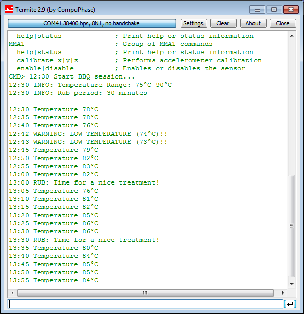 The BBQ Smoking assistant robot works fine. It monitors only the temperature for noew and sends me the status information so I can take care about my ribs. I’m thinking about a graphical view of the temperature data. Sending an alarm SMS messages to my phone? Hooking it up to my WLAN? Taking pictures and sending them? Monitoring more (temperature fire pit, outside temperature, smoke temperature, smoke detector)? Creating a closed loop version: monitoring the temperature and controlling the fire and heat. That would be cool!