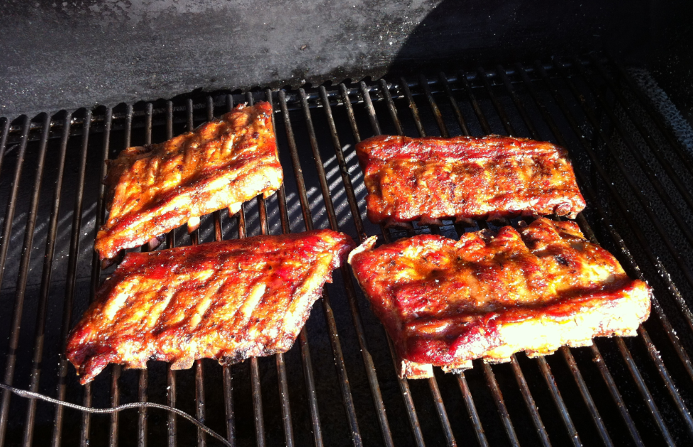 The day before, the ribs get a dry rub. In the smoker, the ribs get a gentle marinade treating about every 30 minutes with my ‘secret’ sauce (apple juice, apple vinaigrette, cane sugar, ketchup and spices from Rudy’s 🙂).